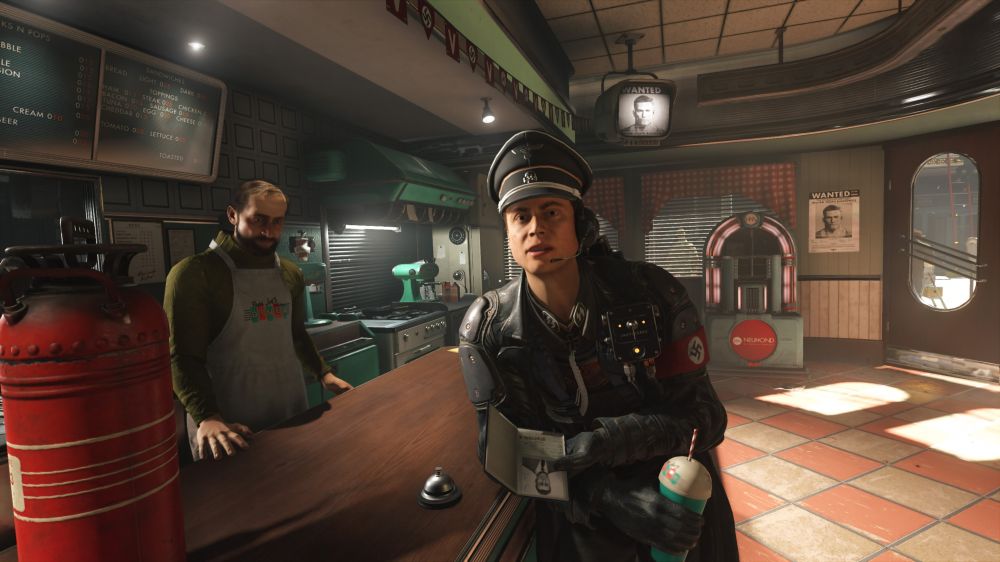 Во второй части произошел ощутимый крен в сторону "очеловечивания" доселе несокрушимого Уильяма Би Джей Бласковица. Даже столь неустрашимый солдат не может сражаться десятилетиями, и нас решили поближе познакомить с демонами, терзающими душу грозы нации. Нам явят частые воспоминания о детских годах, насилие со стороны отца, атмосфера страха и жестокости, всем, что не могло пройти бесследно. Пробыв некогда в состоянии "овоща" целых 14 лет, Бласковиц в ходе финальных событий The New Order опять теряет возможность вести нормальную человеческую жизнь вне инвалидной коляски, что уж тут говорить о партизанщине и окончательном истреблении коричневых полчищ, заполонивших Америку, а с ней и весь мир? В таком меланхолическом состоянии проходит около первой трети игры, однако дальше Wolfenstein становится похожим на самого себя - меньше о юных годах Бласковице, больше о мире вокруг: газетные вырезки, всевозможные пасхалки, рассказы о нелегкой судьбинушке из уст членов Сопротивления. Особо порадовала возможность сыграть в преображенный Wolfenstein 3D на нацистской подводной лодке, право, блестящий ход от шведов. Сразу вспомнились Die Käfer (ливерпульская четверка) с первым космонавтом-арийцем Нилом Армштронгом, весьма достающие моменты из предшествующей части.