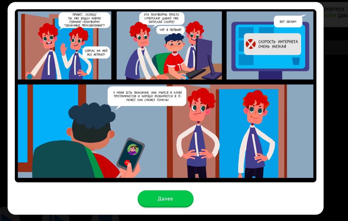 Игра Урок цифры 2019 по теме сети и облачные технологии встречает нас красочным комиксом, после которого начинается сама игра. Впереди нас ждут 10 увлекательных уровней.
