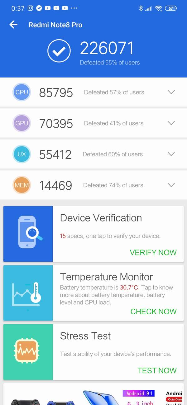 На базе Helio G90T работает Redmi Note 8 Pro, а значит именно он и станет испытуемым в бенчмарке Antutu. Аппарат набирает в тесте более 226 тысяч очков, из которых почти 86 тысяч берет на себя процессор (CPU), а на долю видеоускорителя приходится чуть более 70 тысяч баллов. Помнится, до выхода Mediatek Helio G90T сообщалось, что чип окажется конкурентом Snapdragon 855, однако реальность оказалась крайне суровой. Не то чтобы баллы не дотягивают, техпроцесс в 12 нанометров говорит о многом - это явно не флагманское решение в широком понимании этого определения (для самой Mediatek этот процессор, естественно, топовый).