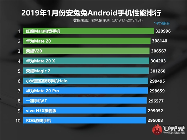 Теперешний рейтинг Антуту можно назвать рейтингом смартфонов Huawei, так как ровно половина девайсов, попавших в этот список, выходцы из станка китайского производителя смартфонов, однако, как ни странно, пальму первенства держит смартфон от Nubia – Red Magic Mars. Этот гаджет набрал 320 996 очков, став самым мощным андроид-смартфоном января 2019 года. За одним китайцем бежит другой – Huawei Mate 20 X с результатом 308 140 “попугайчиков”, а вторым еще один – Honor V20, выбивший 306 567 очков в синтетическом тесте оценки производительности смартфонов. В виде списка ТОП-10 производительных смартфонов января 2019 года выглядит следующим образом.