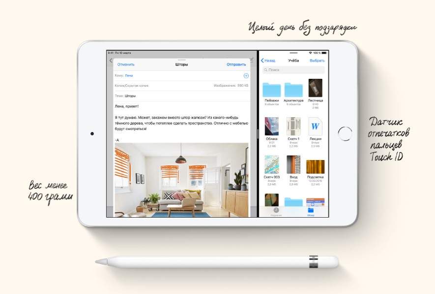 Мы уже отметили, что iPad Mini 2019 получил поддержку Apple Pencil и это шикарнейшая новость. Перо позволяет взаимодействовать с планшетом на совершенно ином уровне, в самом прямом понимании слова - творить. Рисовать, писать, пользоваться многозадачностью с пером намного удобнее, чем без него.