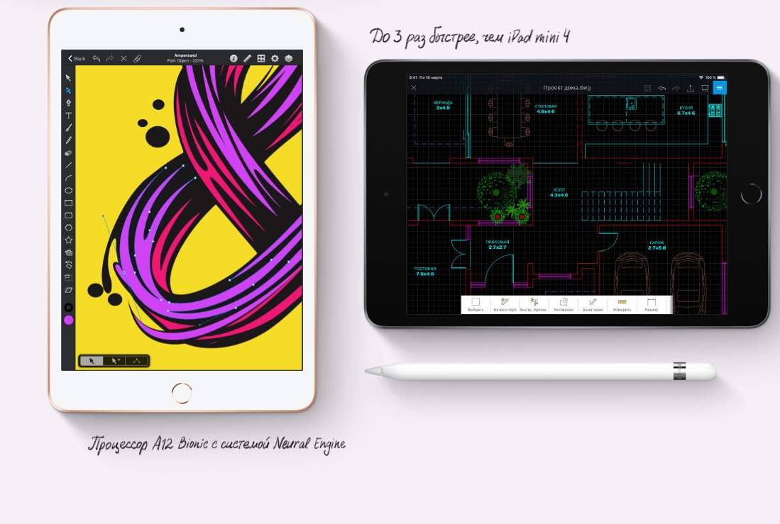 Новинка претерпела серьезных изменений внутри, так как гаджет оснастили топовым процессором Apple A12 Bionic, то есть мощности у него за глаза. Хорош процессор и тем, что у него имеется встроенный мощный нейроблок Neural Engine. Благодаря машинному обучению процессор в кратчайшие сроки распознает закономерности, самообучается и делает жизнь пользователя более удобной. Также мощности чипа хватает на любые игры, дополненную реальность или программы, в частности Photoshop CC. Отмечается, что Айпад Мини 2019 мощнее Айпад Мини 4 в 3 раза! Всего же устройство выйдет в двух вариантах с 64 ГБ и 256 ГБ памяти.